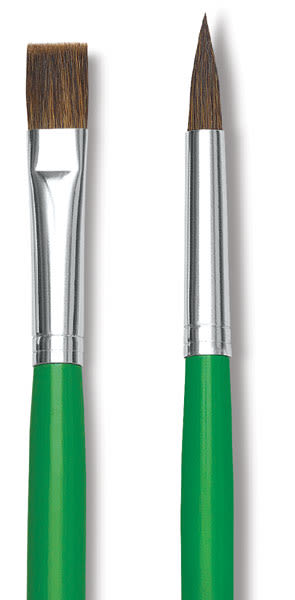 A combination of 60% ox and 40% pony hair makes this brush exceptionally affordable and an excellent all-around brush for students exploring the use of thicker, heavier colors. This brush has a long handle with green gloss finish, and a seamless, polished, aluminum ferrule.