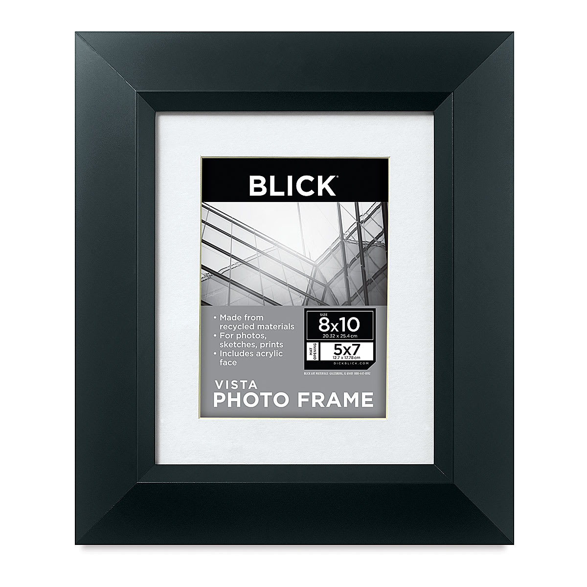 Complement your artwork or photos with this stylish, black polystyrene frame with a soft "peak" profile and a smooth finish. The Blick Vista frame includes a 4-ply, white, bevel-cut mat that is pH-neutral. Also included are a styrene face, black backing board, and hanging hardware. T...