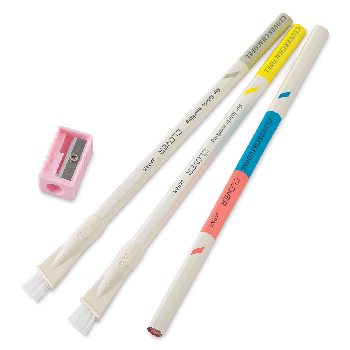 Mark — and erase! — sewing patterns and stitchery designs with Clover Chacopel Fine Point Marking Pencils. The package of three marking pencils includes one each of white and yellow, a double-ended pink and blue pencil, and a pencil sharpener.
