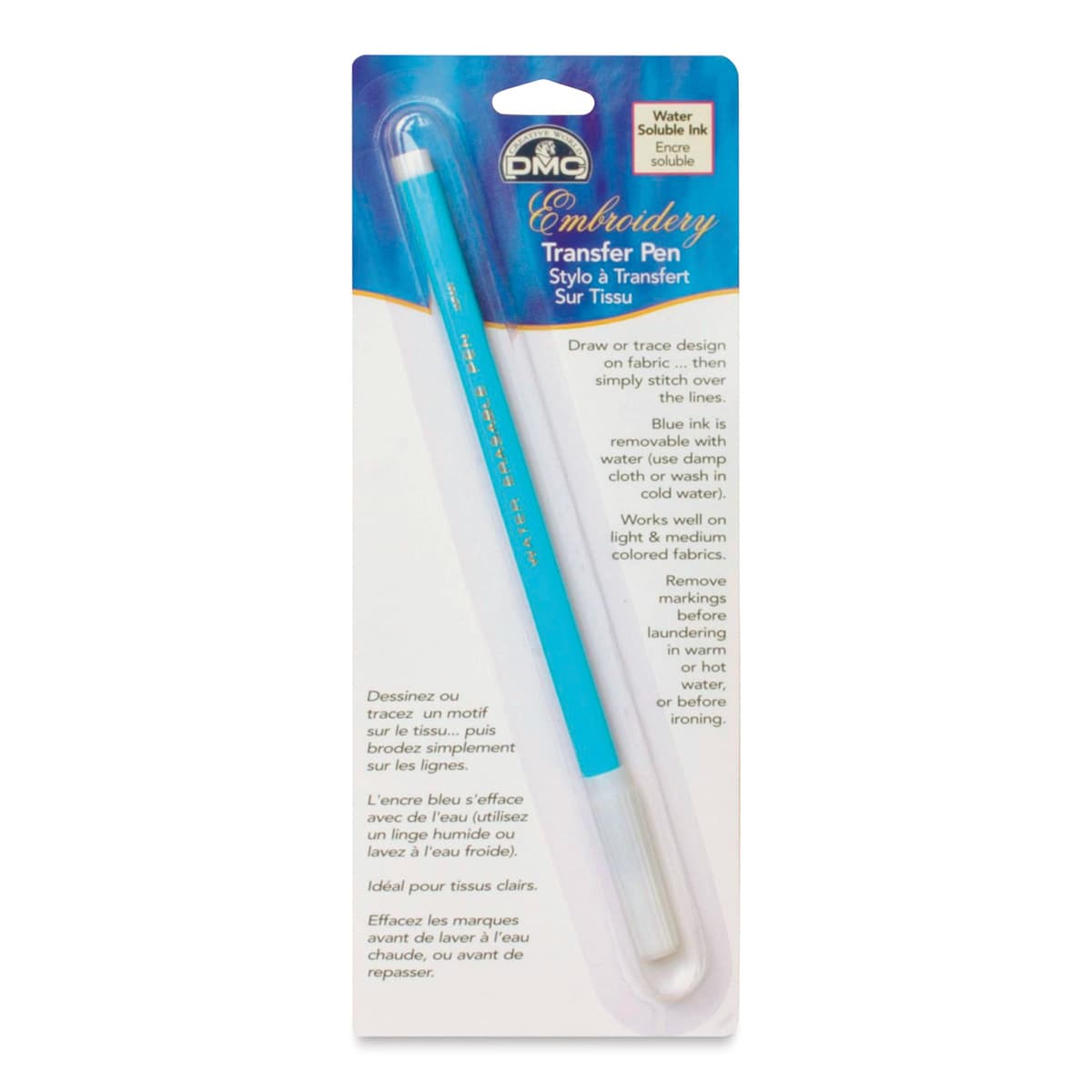 Put your unique designs on fabric with the DMC Embroidery Transfer Pen. It contains washable blue ink that shows up on light- and medium-colored fabrics. Draw or trace your design and stitch over it. The blue ink is removable with cold water or a damp cloth, so you can easily erase any mistakes. Tuc...