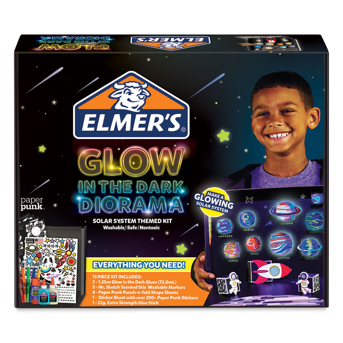 The Elmer's Glow in the Dark Solar Kit has everything you need to make your own solar system diorama. It includes two bottles of Elmer’s Glow in the Dark Glue, an Elmer’s Extra Strength Glue Stick, five Mr. Sketch Washable Markers, and four Paper Punk Punch-n-Fold Shape Sheets and one Sticker Sheet....