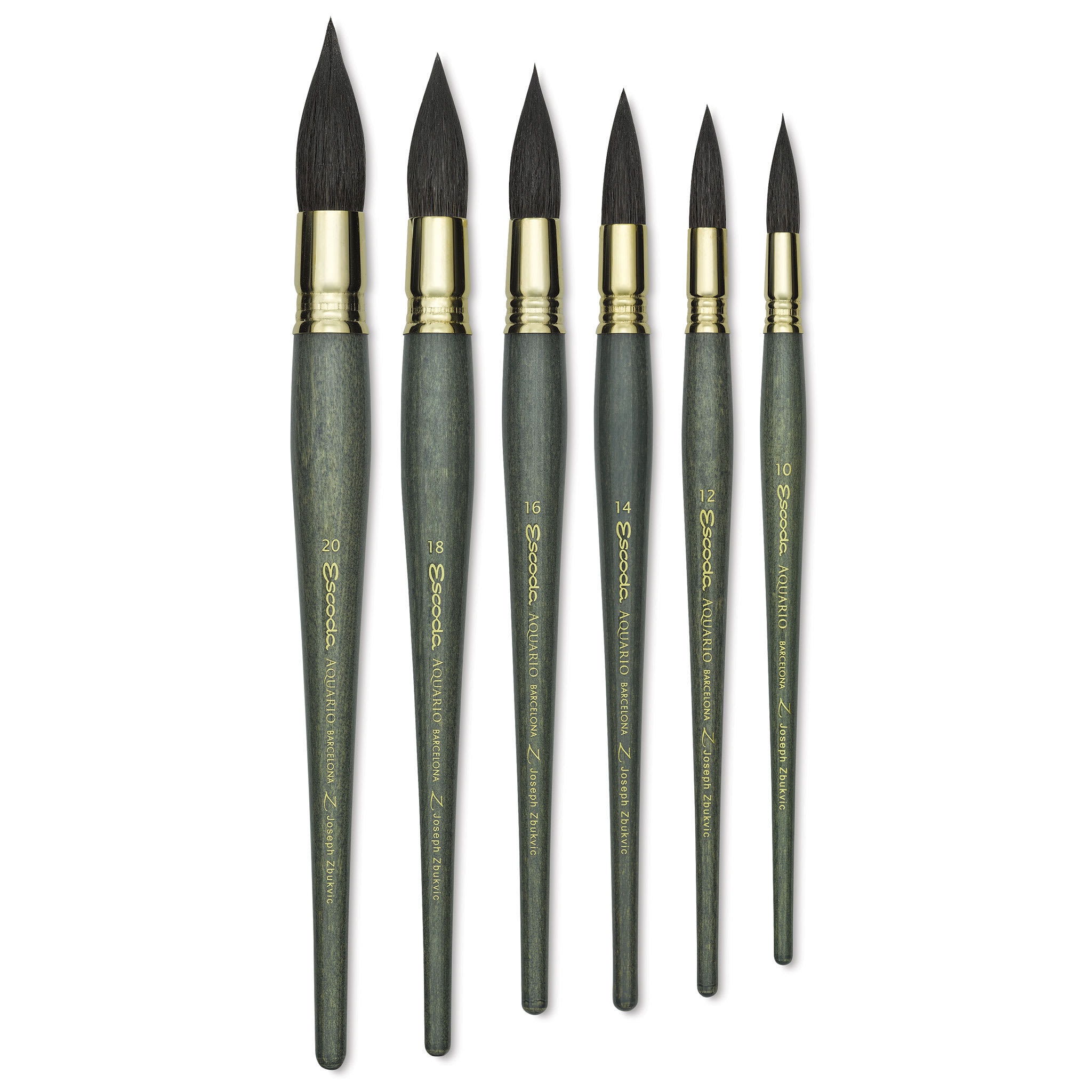 Created in partnership with world-renowned watercolorist Joseph Zbukvic, Escoda Aquario Gold Squirrel Mop Brushes magnify the unique features of the original Aquario brush with a longer length and an improved tip. Pristine, triple-crimped gold ferrules lock the soft, natural squirrel hair into place...