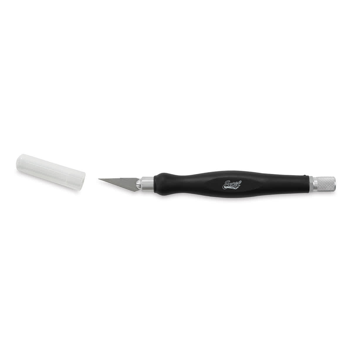 Cut comfortably for long periods of time with the Excel Blades FitGrip Knife. It has a plastic handle encased in a rubberized, ergonomic, soft cushion grip. It includes a #11 blade and features a shatter-resistant, twist-lock safety cap and a four-jaw aluminum chuck.