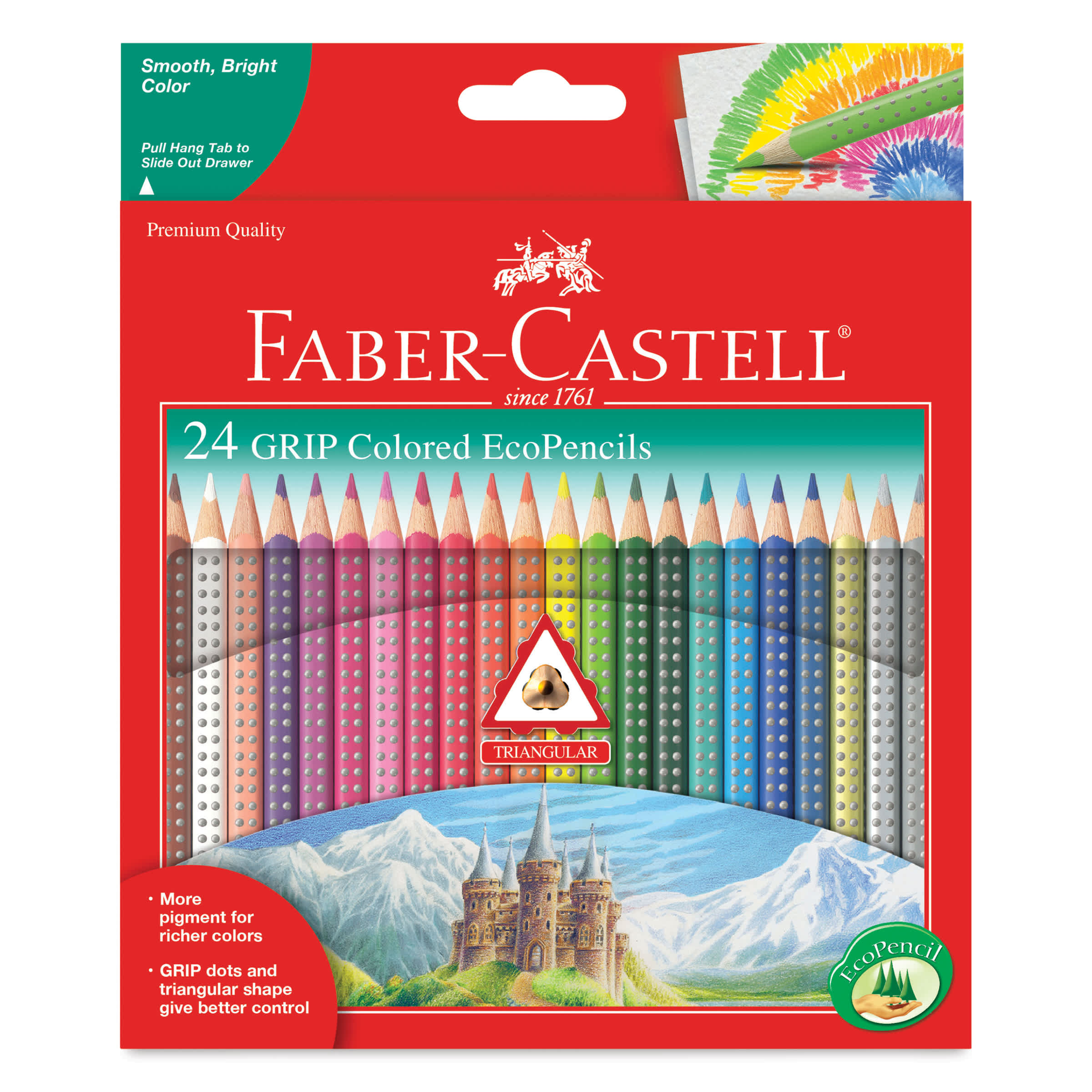 Grip Colored EcoPencil contain more pigment — for richer colors! Sporting Faber-Castell's unique "grip dots," the EcoPencil's ergonomic triangular shape provides the comfort and ease of tireless drawing while preventing it from rolling off surfaces.