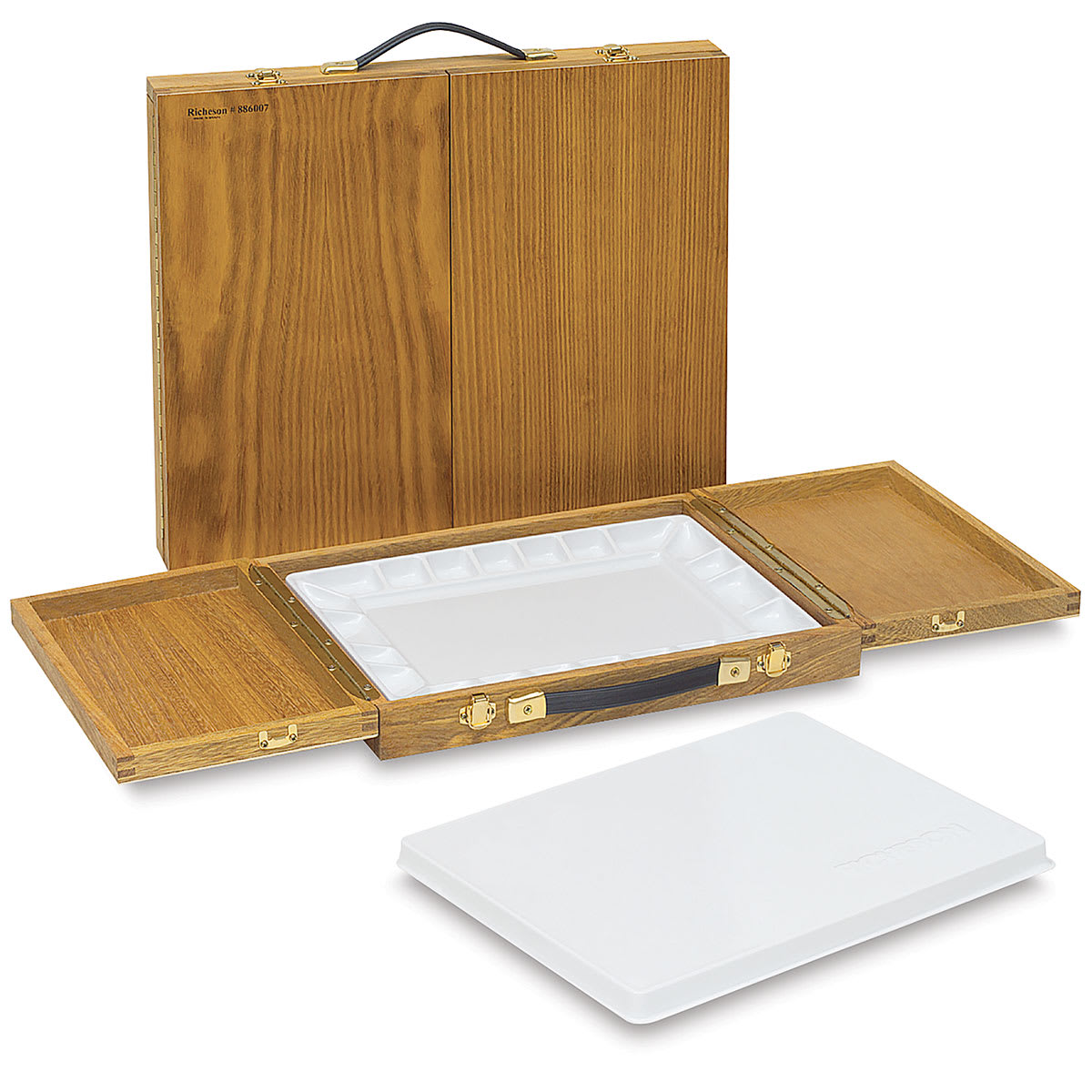 Expand your work and storage space. Rest the French Companion or French Mistress Brazilian hardwood briefcase-style chest on the drawer of a French-style easel or any flat surface. Hinged flaps fold out to expand work area. Both cases include handles for easy transport.