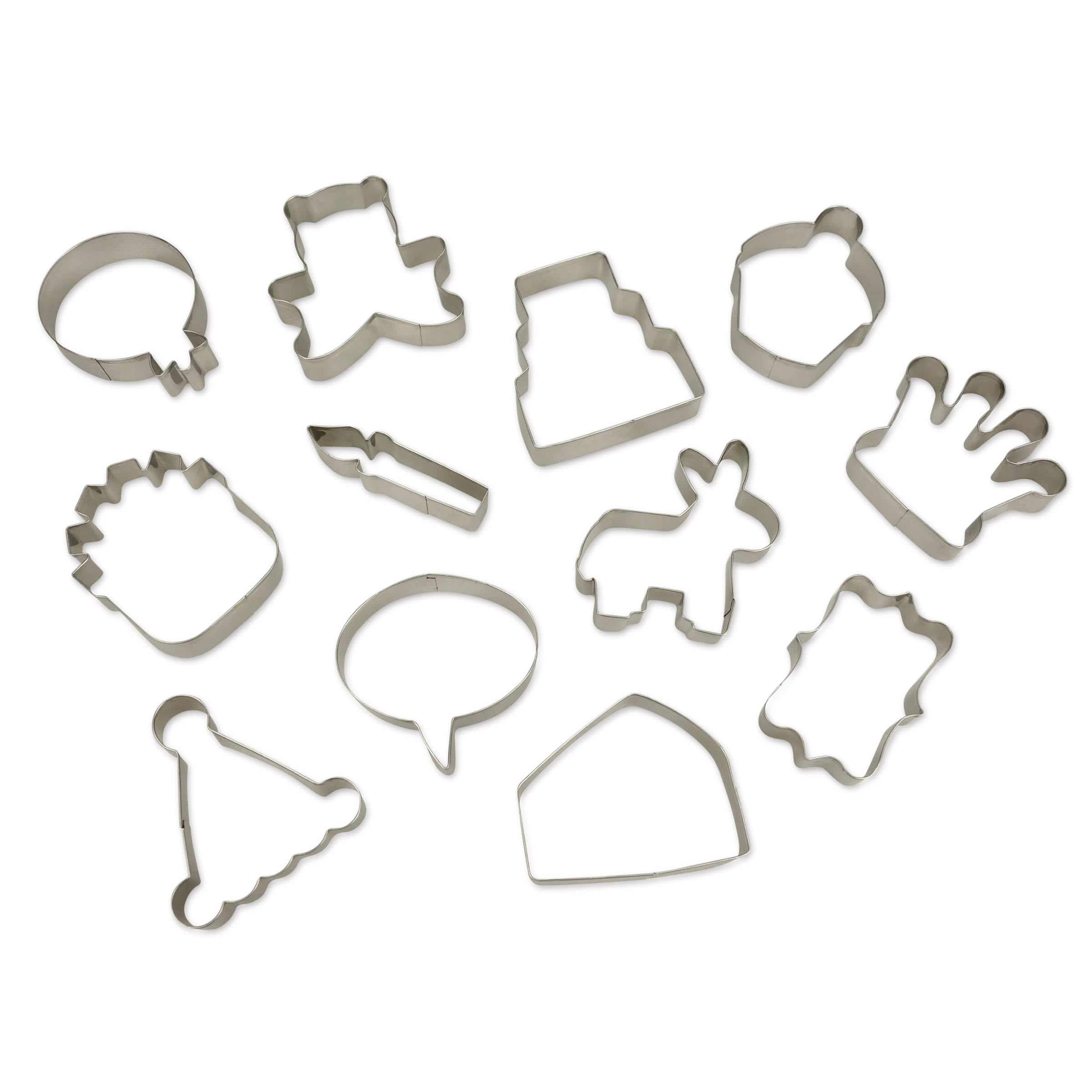 Prepare cookies for birthday parties and other special occasions with the Handstand Kitchen Celebrate! Cookie Cutter Box Set. This set includes 12 stainless steel cookie cutters in a variety of party-themed shapes so you can make festive cookies that will be sure to delight all your party guests.