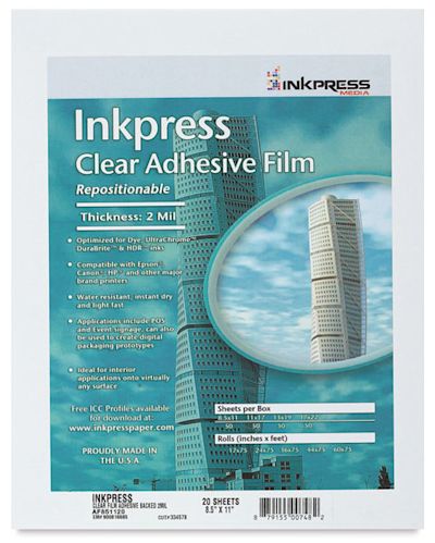 Inkpress Adhesive Clear Inkjet Film is compatible with all inkjet printers, is 2 mil thick, and adhesive-backed. This clear, polyester film can be attached to almost any indoor or outdoor surface. Water-resistant, lightfast, and fade-resistant, it comes in three sizes, 20 sheets per pack.