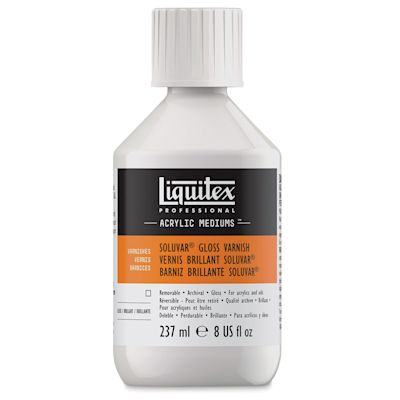 Ideal for acrylic or oil works, Liquitex Soluvar Varnishes are transparent, mineral spirit-based varnishes that can be removed to clean away surface dirt. Durable and non-yellowing, they dry to a level, flexible, non-tacky finish that improves surface durability, increases brightness and color satur...