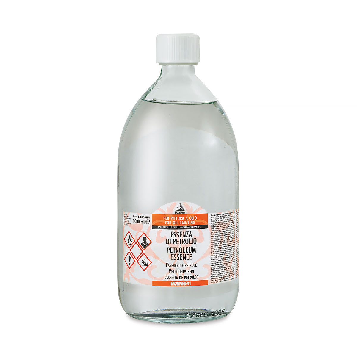 Maimeri Petroleum Essence is a light thinner. It evaporates quickly, with good solvent power, so it's ideal for cleaning brushes. It contains refined petroleum distilates. Highly flammable.
