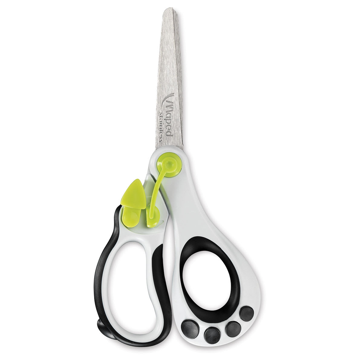 Kids can cut easily through paper, cardboard, fabric, and other materials with Maped Koopy Spring Assisted Educational Scissors. They have large, asymmetrical handle rings that are easy to hold and manipulate by both early learners and special needs students. The spring-assisted blades open automati...