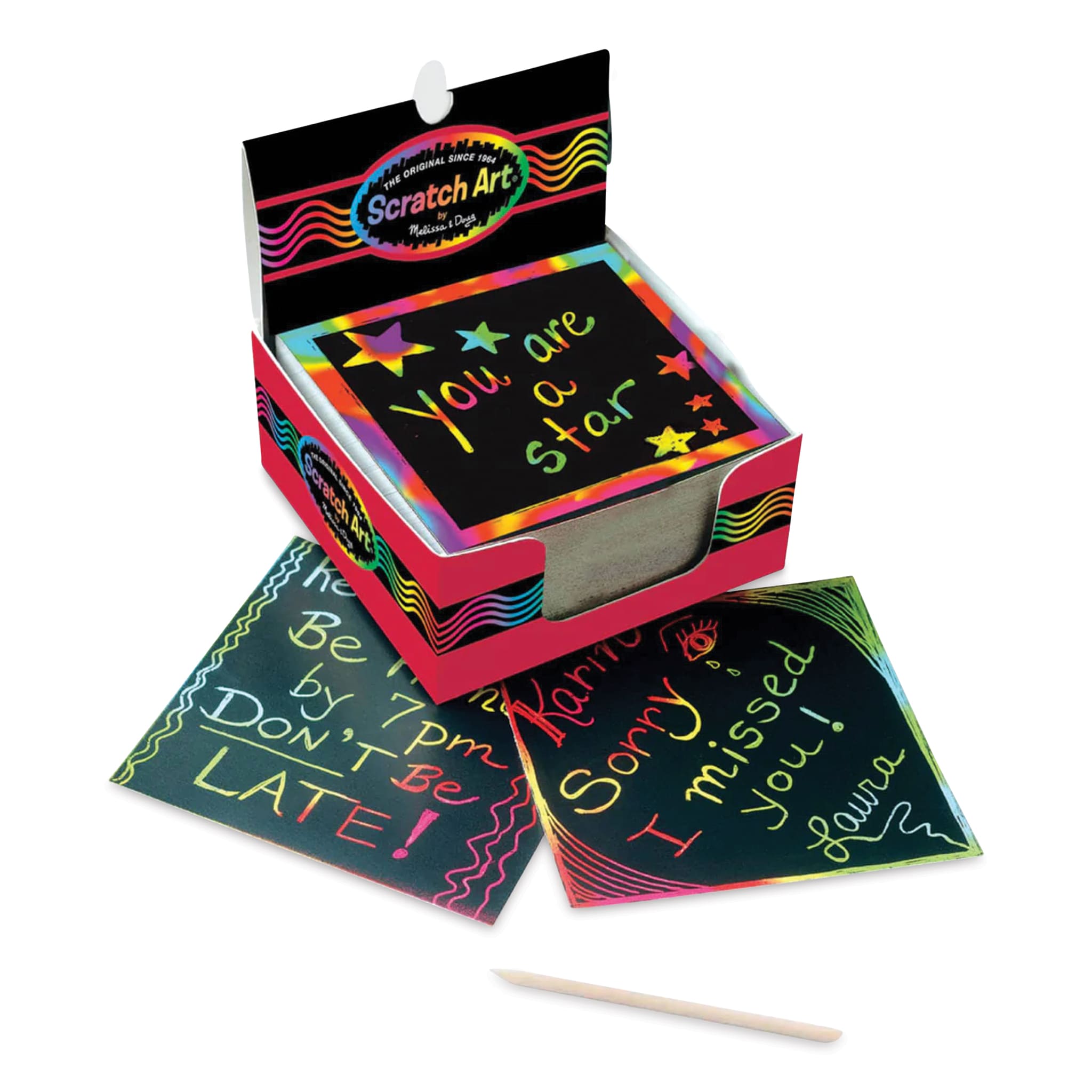 Send colorful messages, create unique gift tags, artwork, and more with Melissa & Doug Scratch Art Mini Notes. Simply use the included wooden stylus to scratch away at the black coating to reveal various colors and patterns. These mini notes are perfect for hands-on, screen-free fun, they make great...