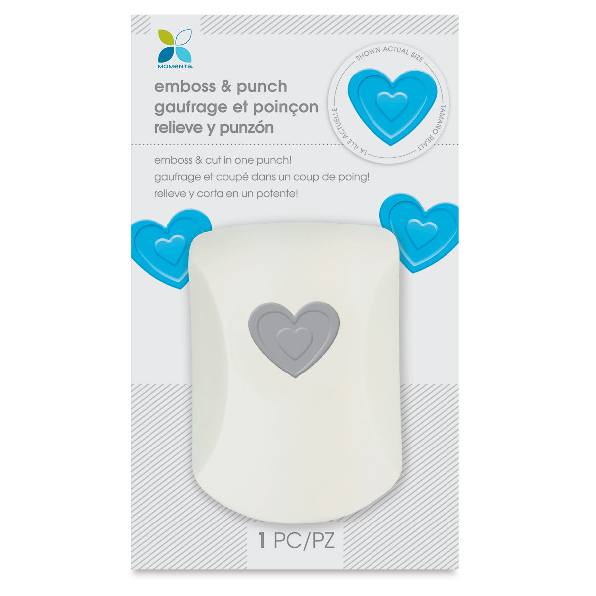 The Momenta Emboss and Punch cuts and embosses in one convenient punch. Use it with different colored papers to create unique art projects and paper crafts. The heart shape is approximately 1" high.