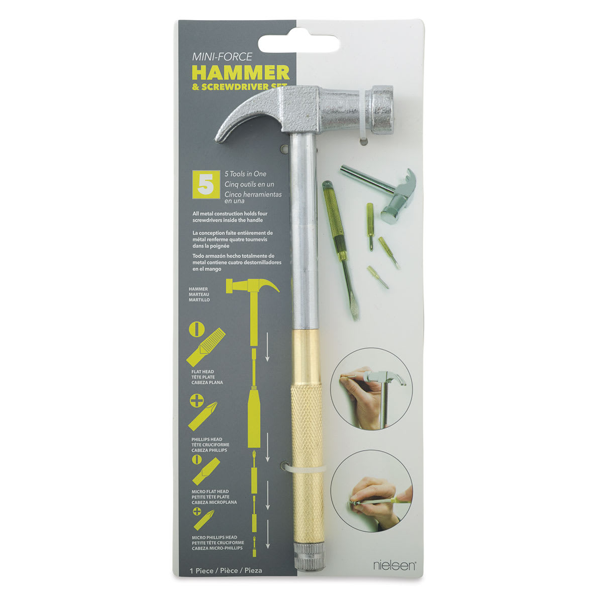 Easily hang your framed photos and art with Nielsen Hammer and Screwdriver Set. Five tools in one! This compact tool with an easy-grip handle incorporates a hammer and compact screwdriver with four interchangeable heads.