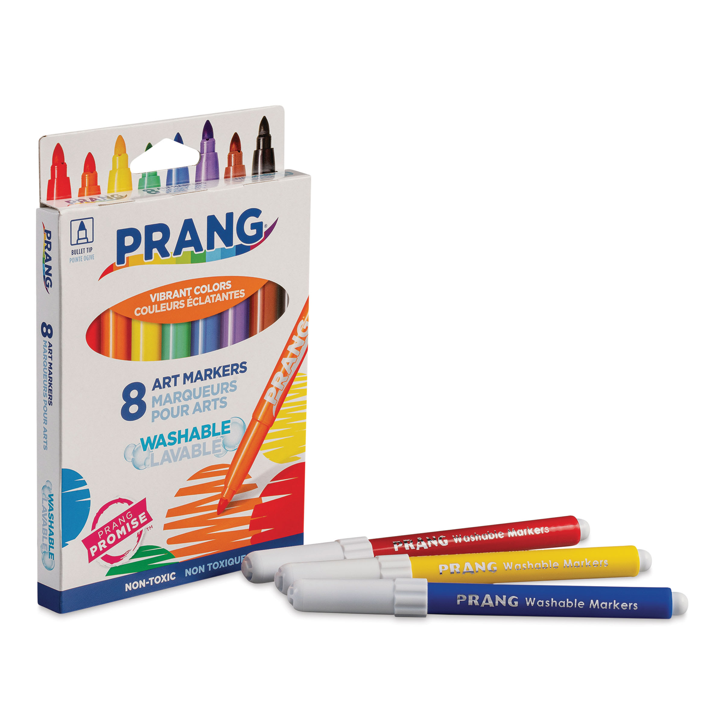 Prang Art Markers offer rich, bold colors that won’t bleed through paper! The super sturdy bullet tip creates broad or fine lines, and the ink won’t dry out, even if the cap is left off for more than 24 hours. Ink washes easily off skin and most fabrics. Ventilated cap ensures safety.