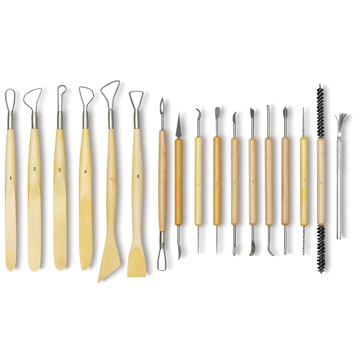 This convenient clear canister with lid holds 69 clay modeling tools in a variety of shapes. This set is great for intricate work, smoothing edges, finishing, trimming, and adding detail.