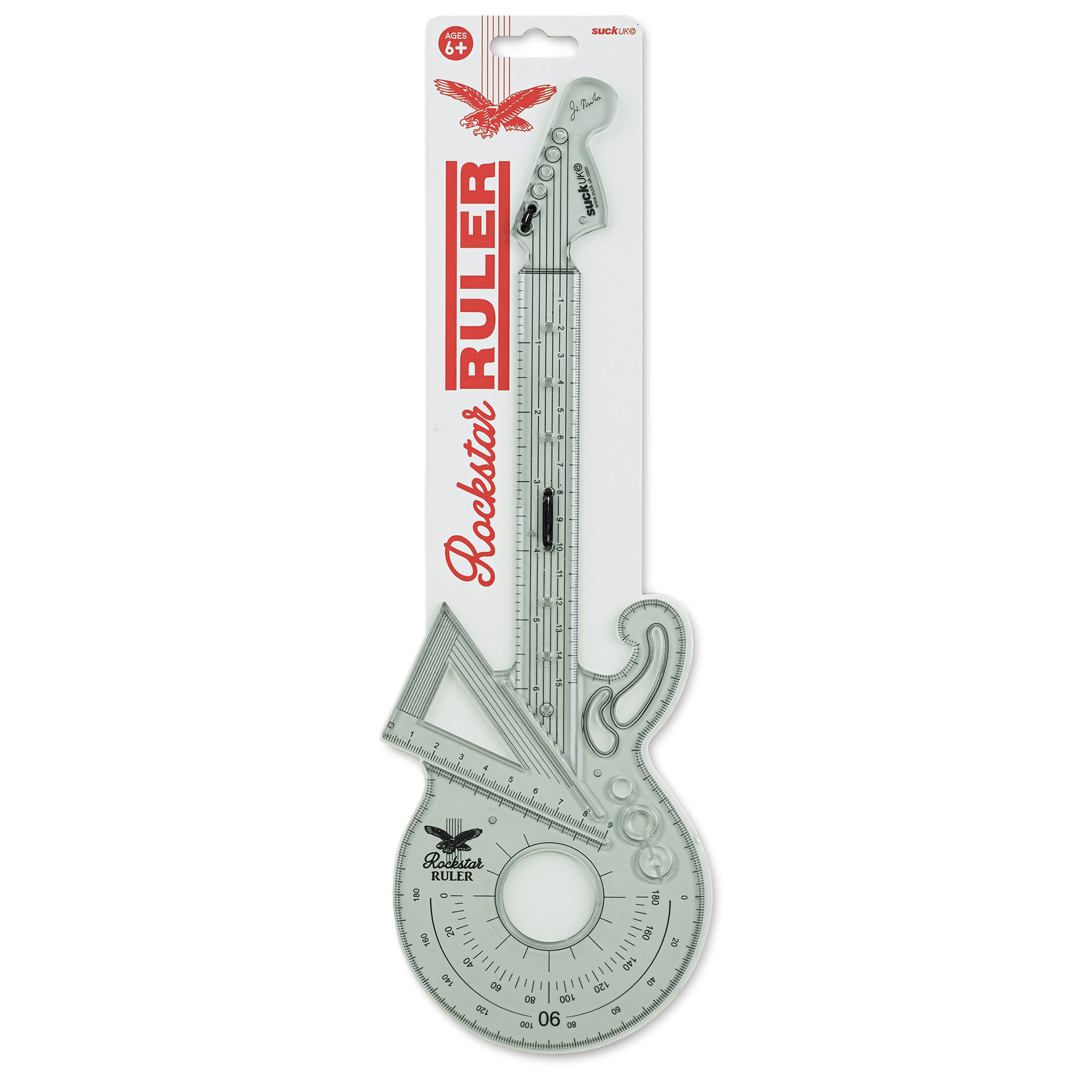 Rule the school with the Suck UK Rockstar Ruler! This transparent, guitar-shaped, multi-purpose ruler features a French curve, circular stencils, an inbuilt 60° set square, a protractor, and an arc tool — so you’ll be able to get through any math equation solo. Great for creating straight lines and ...