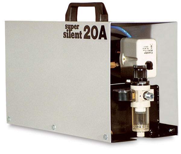 Designed for one operator using one or two airbrushes, the SilentAire Super Silent 20-A Compressor is virtually soundless and is a totally automatic compressor with a tank pressure gauge, line pressure gauge, line pressure regulator, moisture trap/filter, safety/bleeder-valve, air-intake filter, on/...