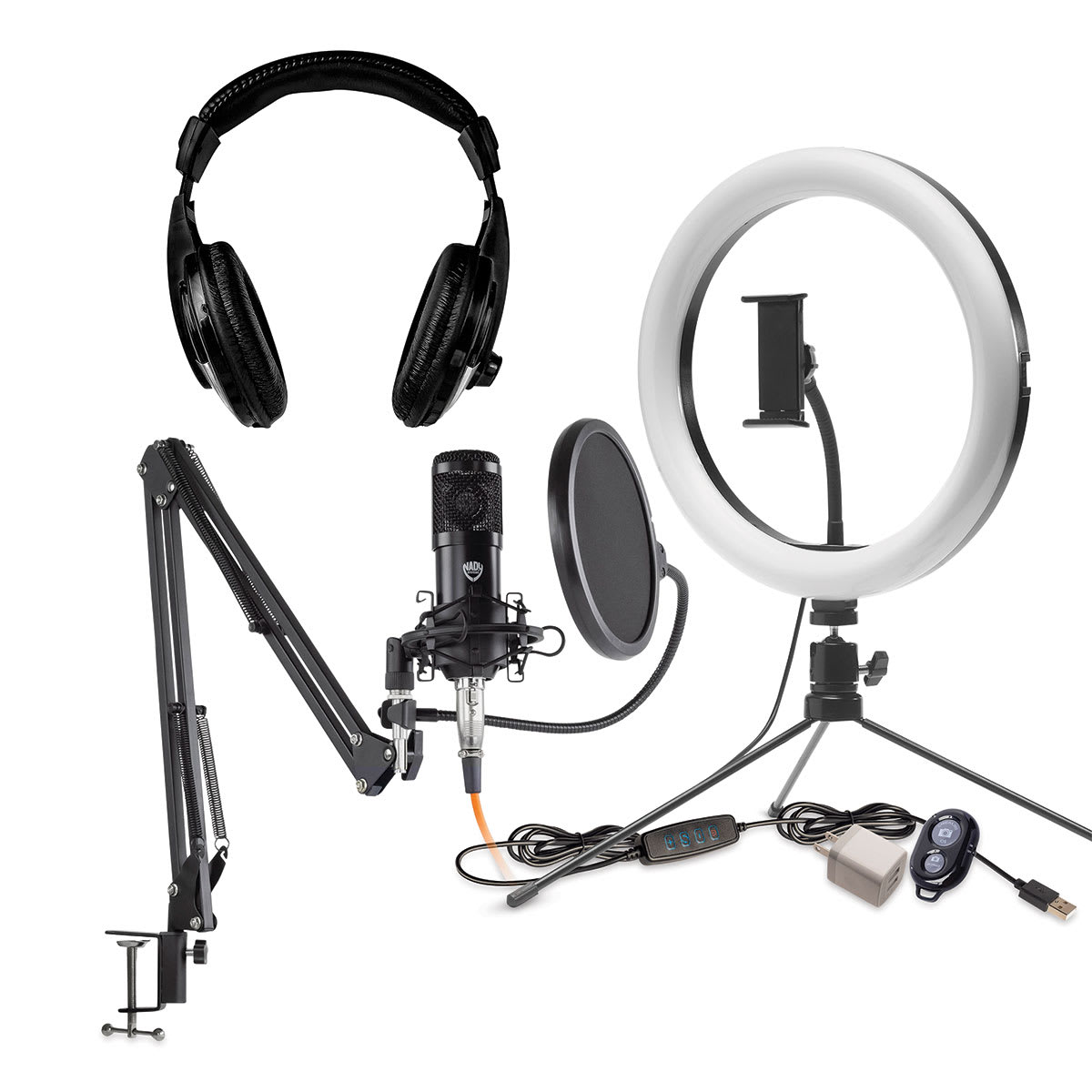 Upgrade to pro podcast level with the Smith-Victor Studio Podcast System. Ideal for podcasting or video conferencing from home or office, the system includes a 10" LED dimmable, tri-color ring light with tripod and phone holder, an SCM-707 9-piece Studio Condenser Microphone and Podcast Kit, and a p...