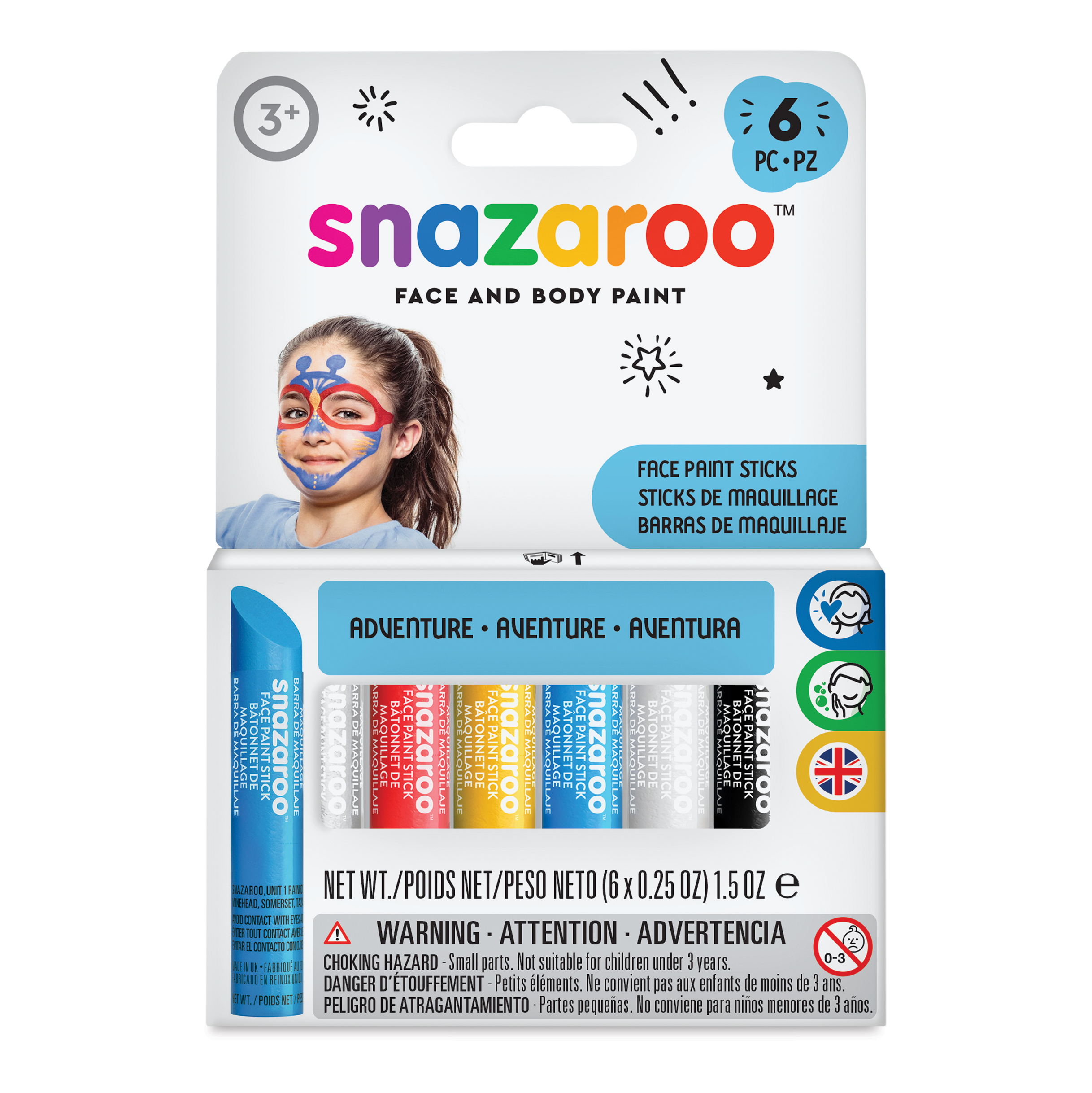 Quickly and easily decorate your face to look like a superhero, animal, or fantasy figure with Snazaroo Face Paint Sticks. These portable color sticks are great for kids’ and adult parties, playdates, fairs, and theater productions. As with all Snazaroo Face Paints, they’re hypo-allergenic and non-t...