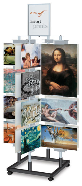 Ideal for shows and presentations, this stylish two-tone matte silver and black finish art tree accommodates up to 32 works of art and features an 11" × 17" (28 cm × 43 cm) vertical frame header. The supports adjust up and down the four 80" (2...