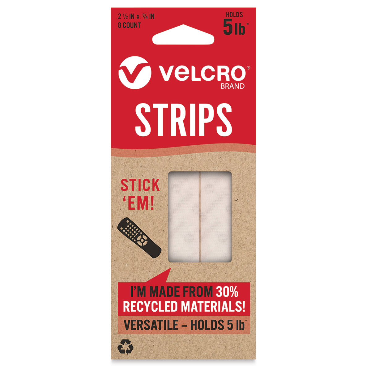 Mount items weighing up to five pounds on the wall or any smooth, flat surface with Velcro Brand ECO Collection Strips. Sustainably sourced from 30% recycled materials, these white peel-and-stick strips are designed for durability — you can open and close them over 1,000 times! Use these hook-and-lo...