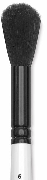 These duster and watercolor mop brushes are made from a mixture of pony and goat hair. They feature seamless black aluminum ferrules and short, white, polished wooden handles with black tips.