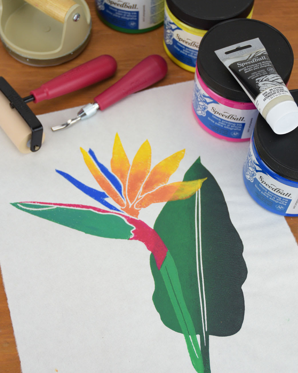 6. Print final design on Mulberry Paper. Clean blocks and brayers with water.