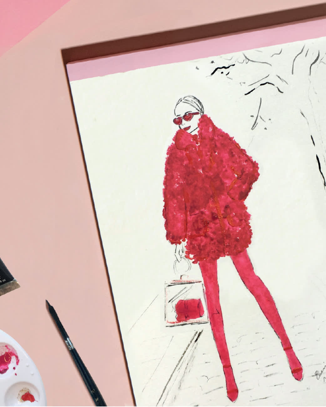 4. Dilute the Rose to colour the tights and bag. Use a dry 00-size brush to apply the Cadmium Red for outlining the coat, shoes, lips and sunglasses.