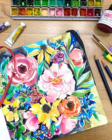 2.) Using watercolor pencil, sketching a floral bouquet.