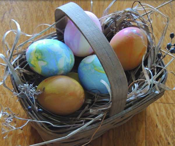 7. Roll each eggshell across the surface of the water until it picks up enough color to cover it completely. You can also dunk the eggshell under the surface and then bring it up to collect the color. Drip additional paint on the surface as needed.